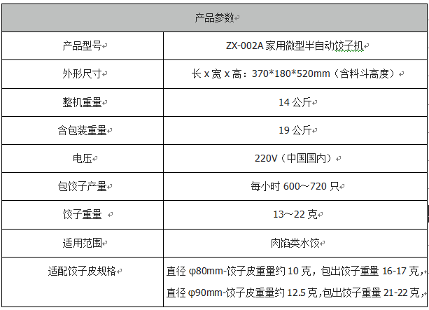 该产品体积小,重量轻,体积比一个微波炉还要小,一个人可以很轻易的搬动,该机包出的饺子自然形成皱折,外形美观,饺子机放到饭桌上就可以使用,同时包饺子后清洗很方便,很适合喜欢吃饺子又不会包饺子的家庭使用,包几分钟饺子够一家人吃了,也可多包一些饺子放入冰箱冷藏起来。该饺子机的一个特点是不需要自己和面,用直接采购回来的饺子皮,自己加工好馅料就可以做饺子,馅量大小可随意调节。可以包不同蔬菜的肉馅类饺子,只要准备好材料,谁都会做,压边牢固,水饺,煎饺,蒸饺均可。
