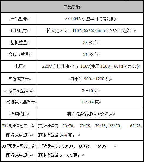 该产品体积小,重量轻,体积和一个微波炉近似,一个人很轻易的可以搬动,该机可以很大程度减轻馄饨店人工劳动强度,降低馄饨店的运营成本。该机的一个特点是不需要和面机,压面机,直接用采购回来馄饨皮,自己加工好馅料就可以做馄饨,馅量大小可随意调节。其优势有,只要准备好材料,谁都会做,不用请师傅,比较灵活,随时做随时停, 更换不同的馅料方便快捷。